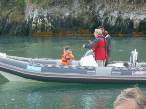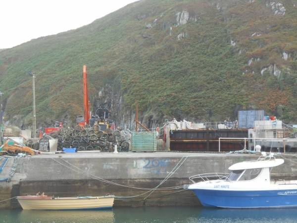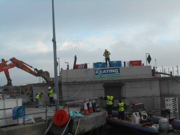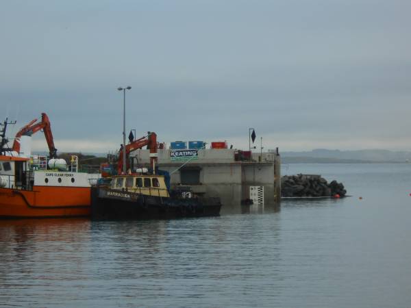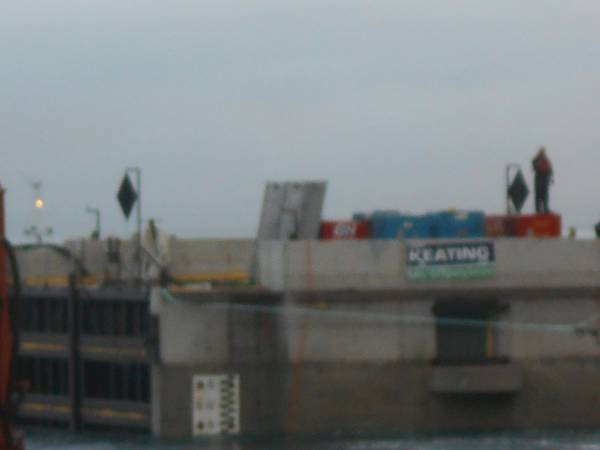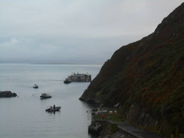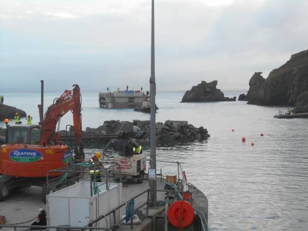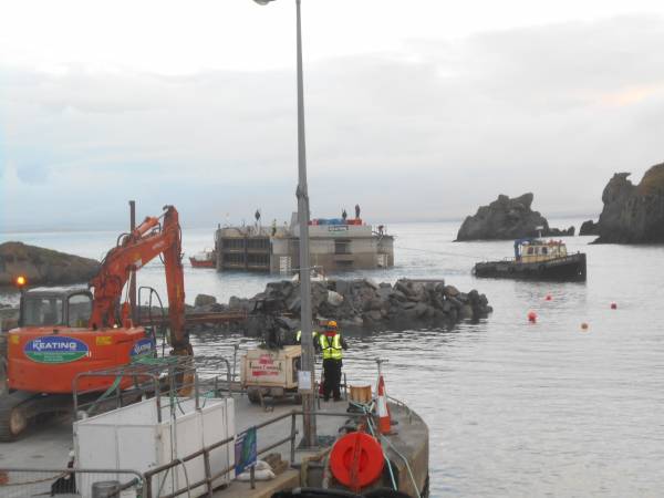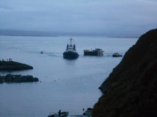 Sunday 28 September saw many early risers on Cape Clear Island as locals gathered before dawn on the cliffs above North Harbour to see the tug Celtic Isle approach the harbour towing the 1,000 ton construction that is the be the new entrance to the Inner Harbour. Around 7.30 am, just outside the harbour mouth the diminutive Barracuda Bay from Baltimore, operated by Vince O’Driscoll took over the tow for the remaining 500 meters or as the larger tug would have no room to maneuver inside the harbour. It seems almost impossible that the small Barracuda could move should a large structure but together with an accompanying pilot boat the impressive structure continued to move closer and closer to its destination. At the harbour mouth itself a number of guidance buoys were placed and the structure was brought surely and skillfully right alongside these buoys as was surely well planned and intended. At this point various lines were put ashore and two excavators were then used to continue towing the structure into position. At this stage the operation clearly became much more complicated and slowed down considerably because of the need to place the structure in the exact position and at various points both excavators and the two boats needed to work in tandem maneuvering the structure in various directions and bit by bit teasing it into position. At one point it seemed some kind of snag may have arisen which seemed to cause a delay of twenty minutes or half an hour and onlookers remarked on the very calm and apparently well practiced manner in which all the team involved conducted themselves. In the end the structure seemed to move the final few meters to its intended position quite easily and fluidly and the end of what was clearly a very successful operation came almost as an anti-climax. By 9.30 am the operation was well completed with time and tide to spare and there was no disruption at all to the ferry timetable as the Dun an Óir 11 departed as scheduled at 10.am. The structure remains in position as it slowly falls with the receding tide whereupon the rising tide will be left in and it will remain in its final position. Congratulations to all concerned.