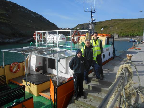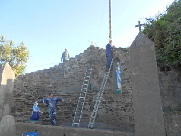 Dún Aengus going to SchullToday is the first day of the Schull run and we show a photo of Skipper Tadhg Ó Drisceoil accompanied by crew members Eoin Ó Drisceoil and Mairtín Ó Mealóid before they set off this morning. Customers will note the welcome addition of a perspex shelter extending back from the saloon, This compliments the addition of some decking in this area which raises the floor level to avoid some of of the wash that sometimes occurs. On another note we see abundant signs of preparations for the Presidential visit next week and show a photo taken yesterday showing Fachtna and Patsi Ó Drisceoil accompanying the ever diligent Seán Ó Ceadagáin in a clean up of the Grotto. Ní  neart go cur le ceile.St Ciaran's Shrine, Cape Clear Island