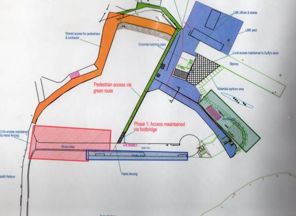 Works are due to commence very shortly on the refurbishment and widening of the inner part of Duffys Pier. This will necessitate closing the inner third of the pier to normal traffic for the duration of the works. Alternative arrangements have been made as seen in the diagram below to provide pedestrian access across the inner dock pier with a bridge spanning the area where the booms are placed during inclement weather. While the ferry will no longer have access to the Inner Dock during bad weather the new storm gates can be closed to provide the required protection. Arrangements are being put in place to facilitate the movement of light cargo along the pedestrian area and for heavier cargo alternative arrangements will be made which may cause some inconvenience but will nevertheless see the required items moved in both directions. We hope that all will show the customary cooperation needed to bring the works to completion in the interests of all concerned. Bail ๓ Dhia ar an obair.