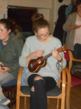 There was a very nice gathering in the Club on Friday 18 September for the now annual culture night event. In attendance was a group of five young musicians from the mainland, Niamh, Hannah, Moire, Ciarán and Cormac who provided us with outstanding traditional music and song. Present also were three artists, Jacqueline, Angie and Eileen who will commence a 10 day residency o n the Island next weekend part funded by Cork County Council Arts Office. Amongst the tasks ahead are some clay/plaster workshops with the Island Community and to this end they conducted a most interesting demonstration at the event. While the visitors were good our own musicians, singer and dancers were not found wanting as the photos show. It was good to see that Leah has mastered the ukulele and can now provide musical accompaniment to her beautiful singing voice. Present also were Ken and Deb Long from the United States. Ken is descended from the Shipseys./Sweeneys from the Glen and they were very pleased indeed with the welcome they found on the Island. We are grateful to Éalaíon an Gaeltachta Teo who part funded this event.