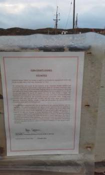 Today as we removed the planning notice for the distillery from the pier we thought readers might like to remind themselves of the most expensive notice in Cape Clear Island history. This cost a staggering €2,438.75 in resubmission fees after Cork County Council Planners ruled that it was vital for the planning application to proceed. The notice reads "Comharchumann Chléire Teo intends to apply for permission for development at this site, Cnocán na mBáirneach, Cape Clear, Skibbereen, Co Cork." Cnocán na mBáireadh is 2 miles away by road from this site.