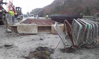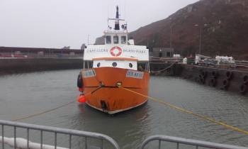We enclose some photos showing the current practice for securing the Cailin Óir in bad weather pending the completion of the works on the pier sides. Also a photo showing the formwork for laying the second slab of the new pier section, work which was completed successfully yesterday.