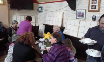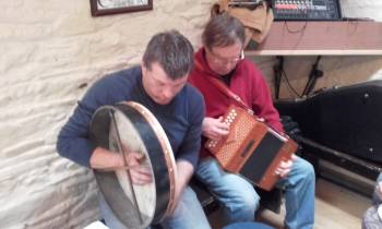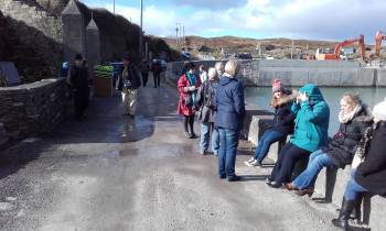 We show some photos from St Ciaráns Day starting with islanders gathering at the Shrine for the annual prayer service following the blessing of the boats. We show a photo of the famous clay plaster caster casts assembled for exhibition in Club Cléire and a photo of musicians Mairtín and Steve in full flight, at what turned out to be a very relaxed and pleasant social occasion. Thanks to Cara, the musicians, and to everyone else who helped to make the day a success.