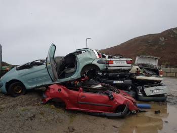 For residents of Cape Clear Island the sight of scrapped cars being arranged in an orderly pile, prior to their removal from the Island is always a very welcome one. They do tend to accumulate in our rust friendly climate and the annual cleanout, organized by our Crew member Tadhg Ó Drisceoil helps to keep the Island looking well. Go raibh maith agat Tadhg.
