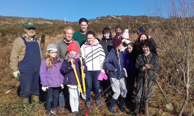 OK Great work has already been accomplished this year with tree plantings already carried out by Muinteoir Fergal and Scoil Náisiunta Inis Cléire and also by Oisín., go raibh maith agaibh. The main community tree planting event is planned for Saturday next, 24th February, at 10 am and all are welcome. As usual we aim to have 300 trees or more planted in the Mass Track area this year in total. Photo some of those ( not camera shy) who took part in last years meitheal by young and old which planted 150 trees on that occasion. Weren't they a fabulous brunch ?.
