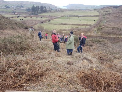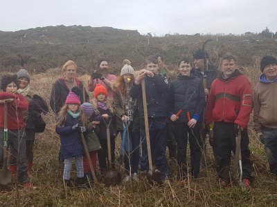 There was a great turnout for today's tree planting on Cape Clear with over 150 trees with an enthusiastic bunch of volunteers, young and old. Already this year about 100 trees have been planted by Oisín and by Scoil Náisiúnta Oilean Chléire and with another 100 or so to go there will be over 350 new trees when all is done. Volunteers were very impressed with the progress made by last year's trees and we took a photo behind some of these to show how well they have taken.  We also show the area where the main planting occurred and finally a photo of a lovely Oak tree planted by the children of Scoil Náisiunta, nach bhfuil sé go han deas. Go raibh míle maith agaibh to all and lets hope our National Rugby Team perform as well later today as our Cape Clear Tree Planting Team. Cléire go brách.