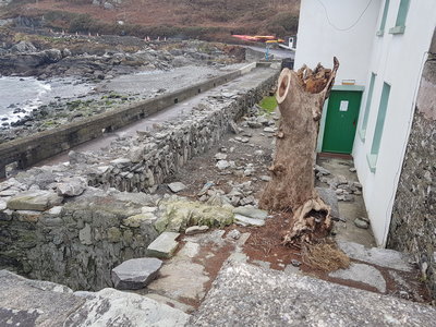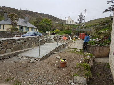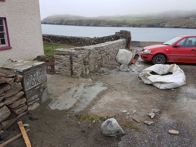 Hostel walls under repair Dec 2017We show some photos of the works in progress on the Youth Hostel Walls since December last which were recently completed by the entrance ramp shown. The Hostel is now largely restored since Storm Orelia and open for business and we look forward to a busy season. The Hostel has contributed enormously to the Island over many years not merely as a lodgment for visitors, however welcome they may be but also for the many visitors who have contributed profoundly to the social and cultural fabric of the Island in different ways. You know who you are, we know who you are and we hope that the Island and its Hostel will continue to attract you and your caliber of visitor for many years to come. Ar scáth a chéile !.Entrance to Hostel 2018